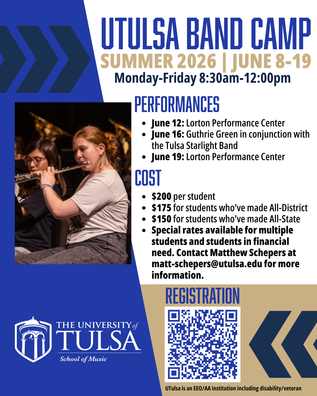 Visit https://utulsa.edu/academics/arts/academics/departments/music/music-camps-workshops/band-camp/ for more information.
