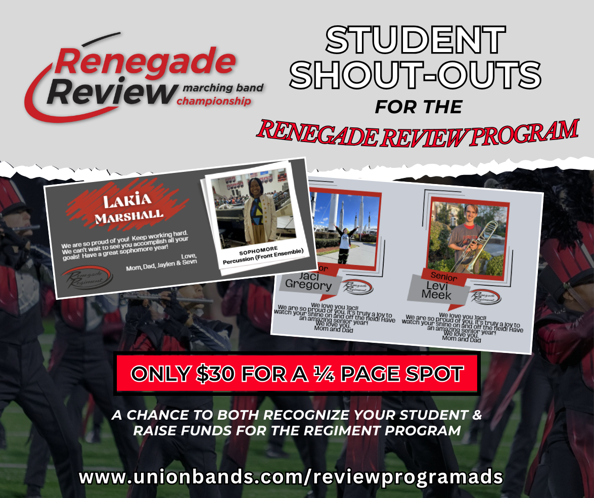 Celebrate your favorite Renegade Regiment member with a personalized shout-out in our official Renegade Review event program! Each shout-out is a ¼-page spot featuring your student’s photo and a special message from you. It’s the perfect keepsake for your family, a fun surprise for your student, and a meaningful way to show your support. Best of all, every shout-out helps fund the Renegade Regiment and keeps our program strong!